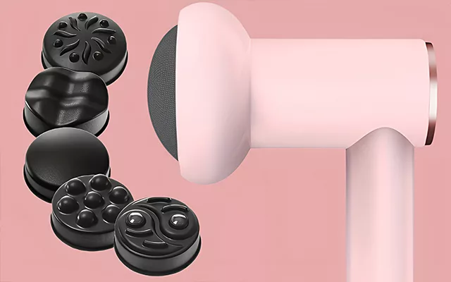Denna handhållna massageapparat levereras med flera olika munstycken. Varje är utformat för att rikta in sig på en specifik muskelgrupp.