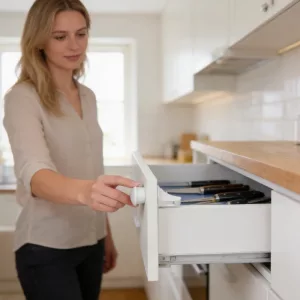 Vår ettåring brukade dra ut kastruller och glasskålar. Efter att vi satt in dessa lås är skåpen stängda, och köket ser fortfarande normalt ut framifrån.