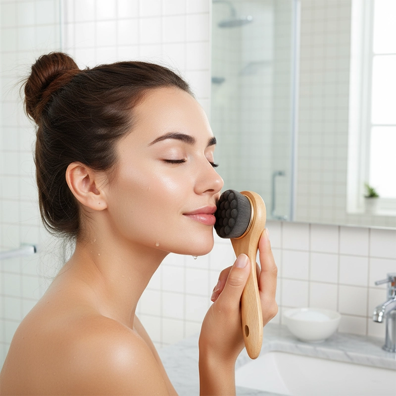 Bambu ansiktsborste för djuprengöring med långt handtag