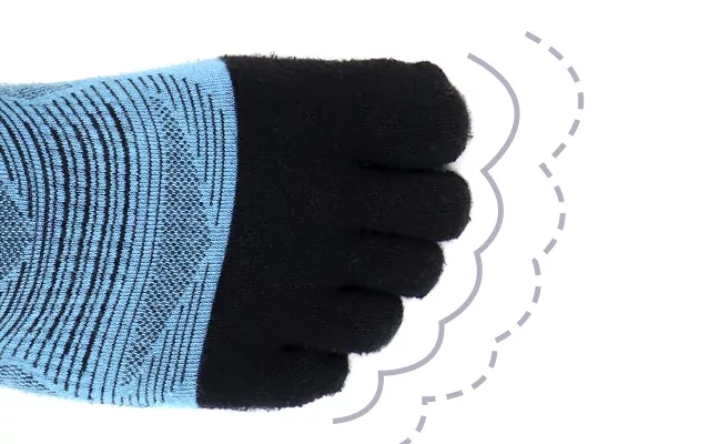 Den innovativa designen ger en åtsittande känsla utan att orsaka tryck. Varje tå är vadderad mot friktion, vilket ökar komforten vid rörelse.