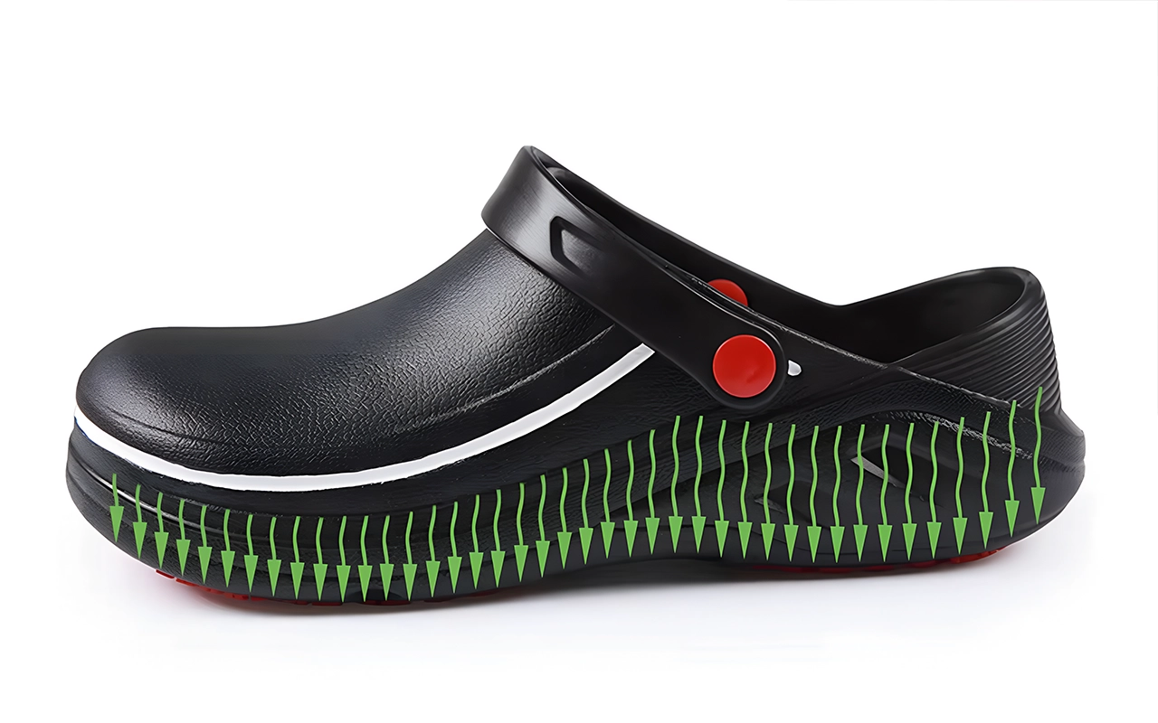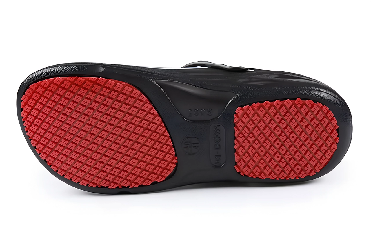 Våta golv och oljiga fläckar är inte längre ett problem. Det unika mönstret på sulan håller varje steg stadigt och stabilt.
