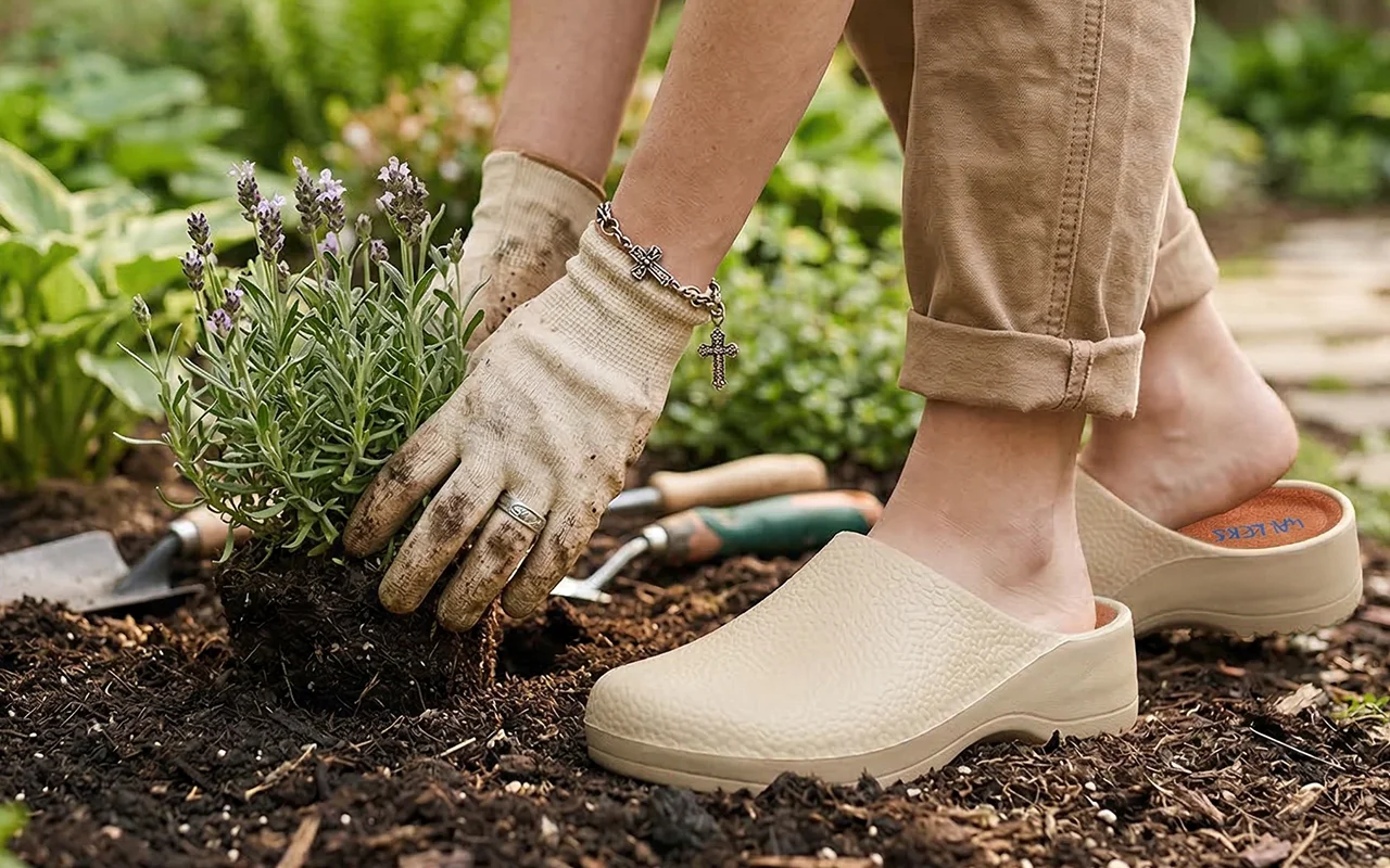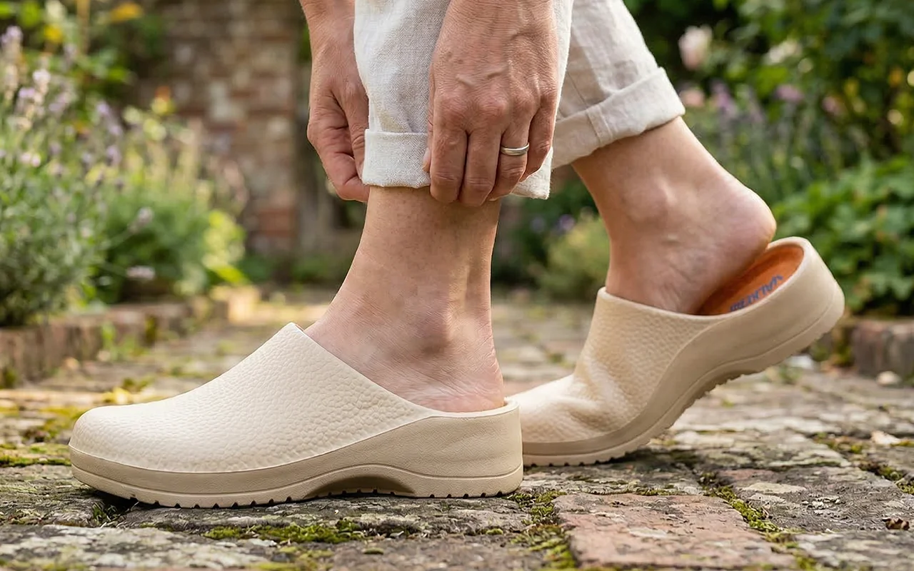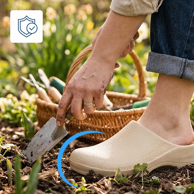 Den stödjande designen avlastar trötta fotvalv. Mjukt foder minskar ömhet så att du kan stå längre i trädgården eller på jobbet.