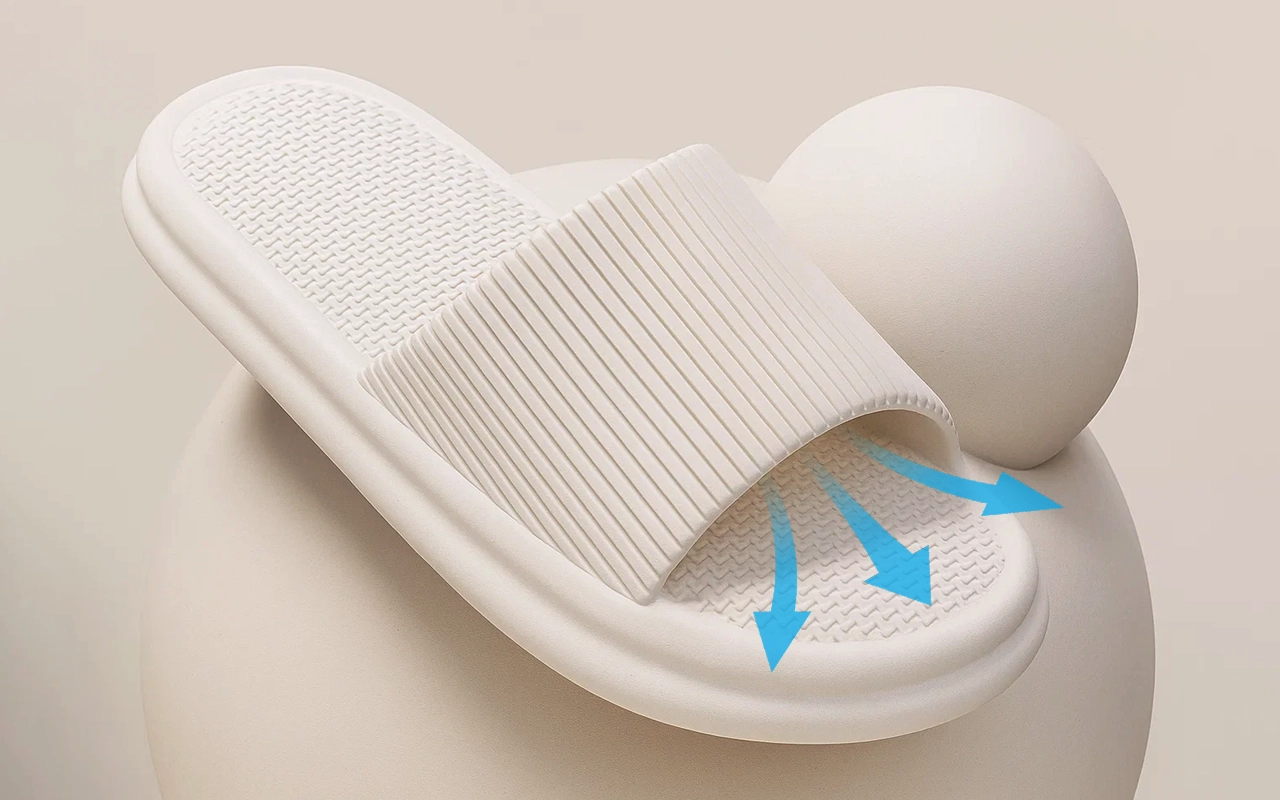 Öppen design låter luften cirkulera fritt för en sval och bekväm miljö. Vattentätt material håller fötterna torra och luktfria varje gång.