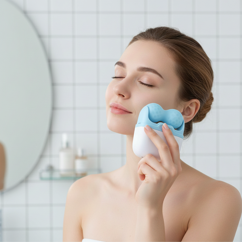 Jag använder ansiktsrollern efter varma duschar för att lugna rodnad på kinderna. Den kyler direkt och gör att huden känns slätare och fastare.