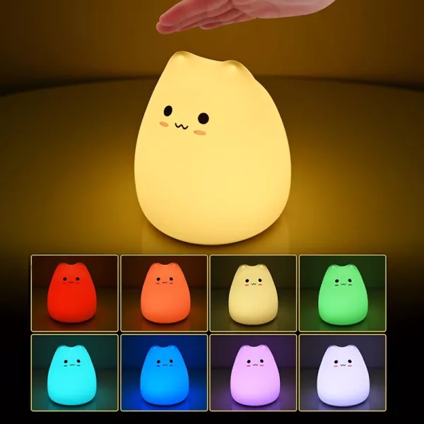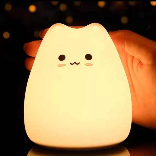 Köpte den här söta kattlampan till min dotter. Hon knackar på den själv vid läggdags, väljer en färg och somnar nu mycket snabbare.