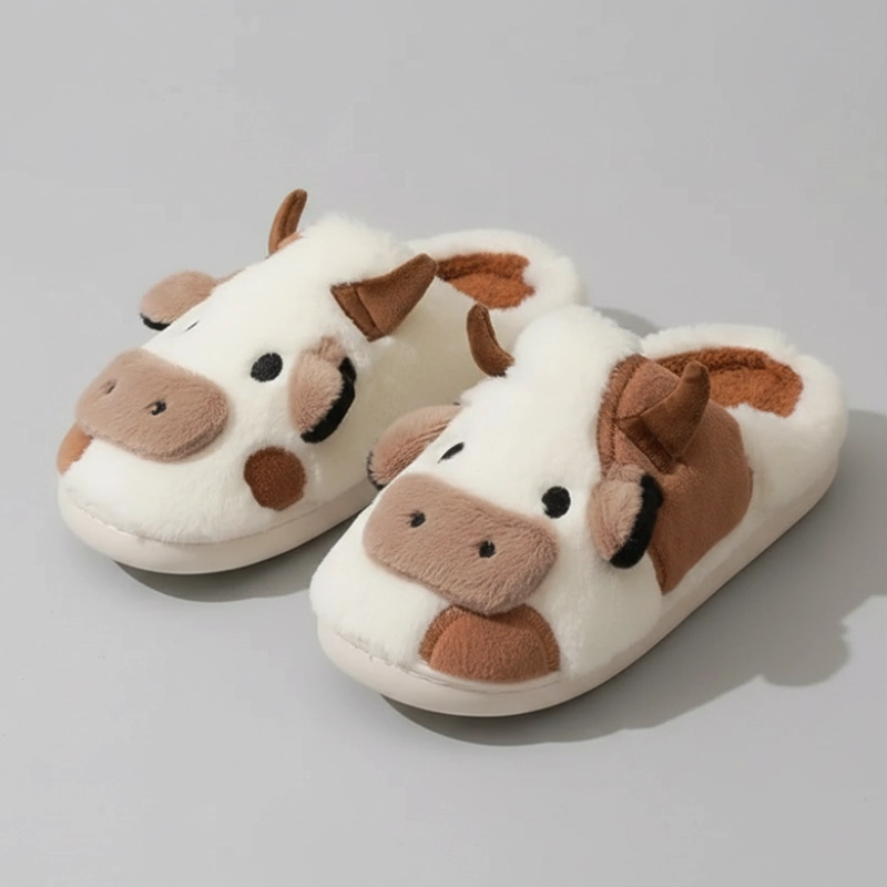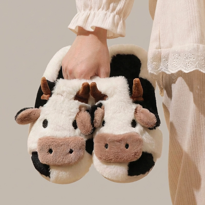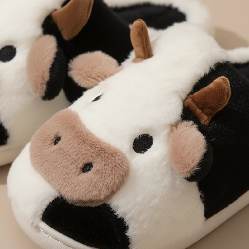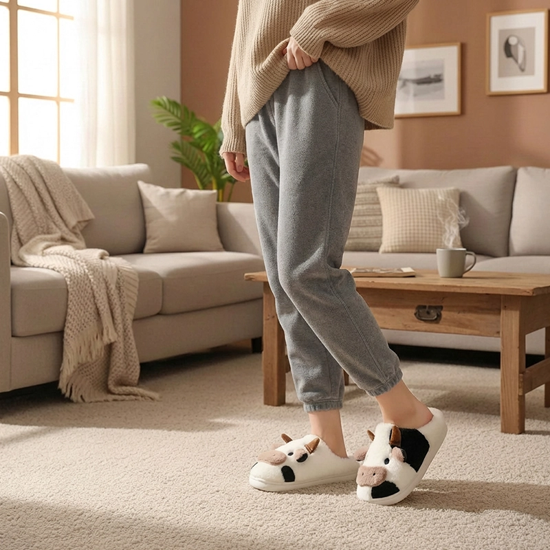 Bekväma kossatofflor är perfekta för att slappa hemma. Min fru och jag matchar i dem, vilket är riktigt kul! Antihalken fungerar bra på våra trägolv.