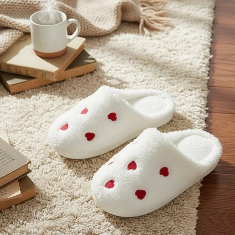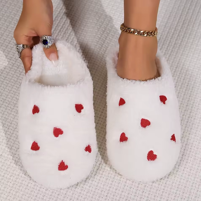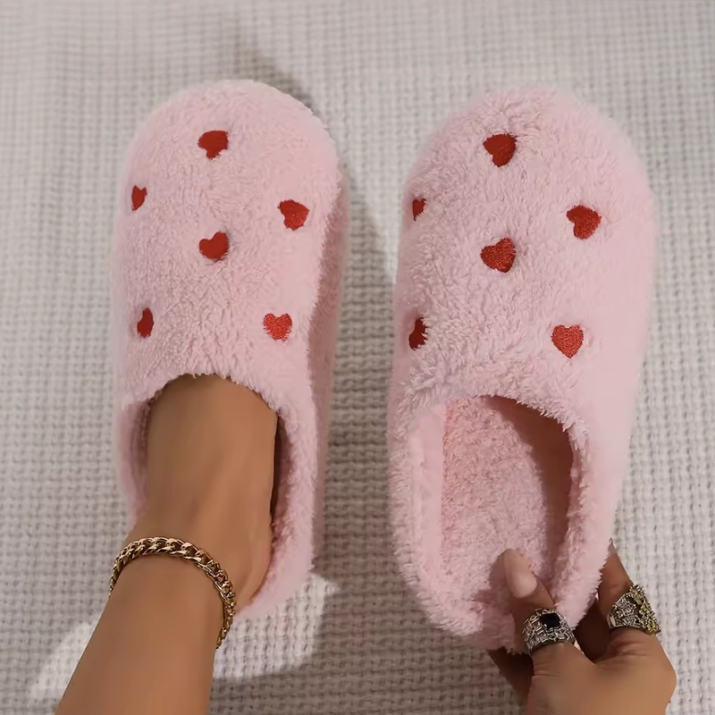 Söta hjärtan ger varje outfit en glad touch. Dessa tofflor gör det extra trevligt och roligt att slappna av inomhus.