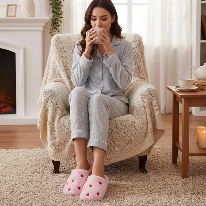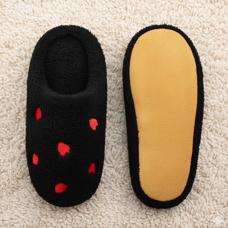 Njut av en fridfull kväll hemma utan kalla tår. Varje steg känns mjukt på både mattor och hårda golv. Det lekfulla hjärtmotivet får dig att le. Mjuka sulor hjälper dig att röra dig tyst genom varje rum.