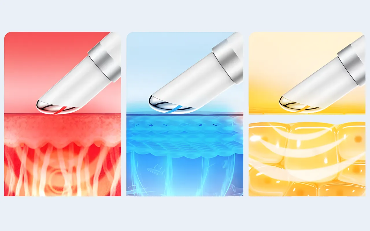 Denna innovativa enhet erbjuder heltäckande hudvård. Den kombinerar EMS, värme och ljusterapi för att aktivera cellreparation och förnyelse.