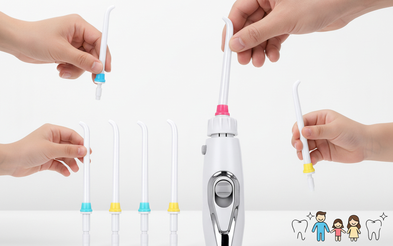 Varje munstycke har en egen färg för familjebruk. Alla får en ren och säker upplevelse varje gång.