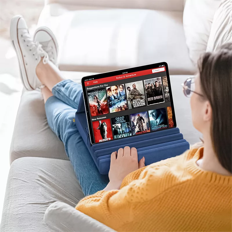 Detta kuddställ är så bekvämt och mjukt mot mina ben. Jag tittar på filmer i sängen och min surfplatta halkar aldrig. Älskar den lilla fickan för mina hörlurar!