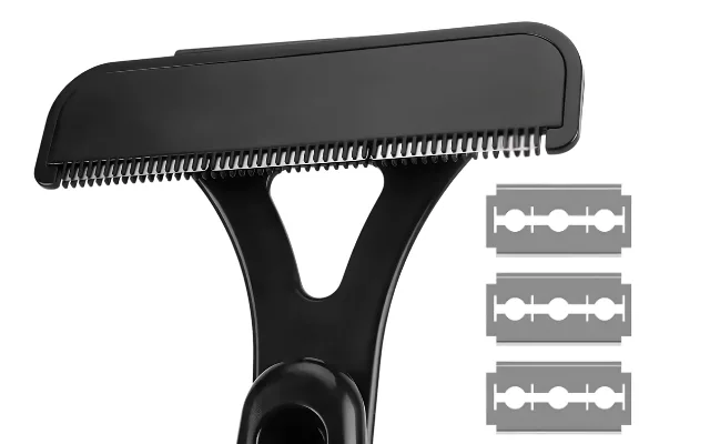 Den här rakapparaten är perfekt att använda själv. Handtaget når mitten av ryggen och de vassa bladen tar allt på en gång.