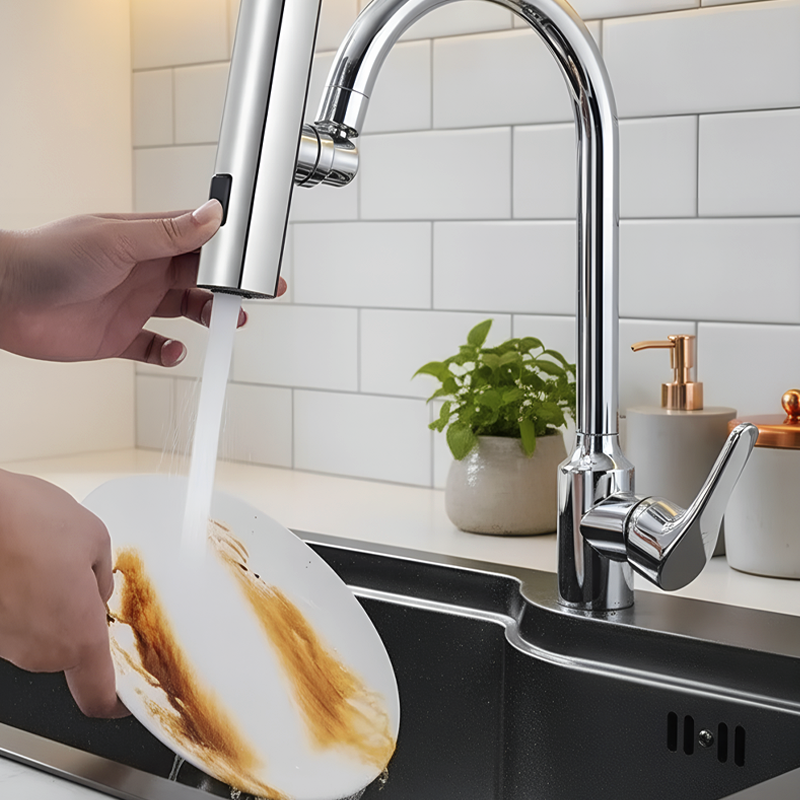 Inga fler stänk! Jag kan växla från en mild sköljning till frukt till en stark stråle för stekpannor på en sekund. Till och med mina barn kan använda den.