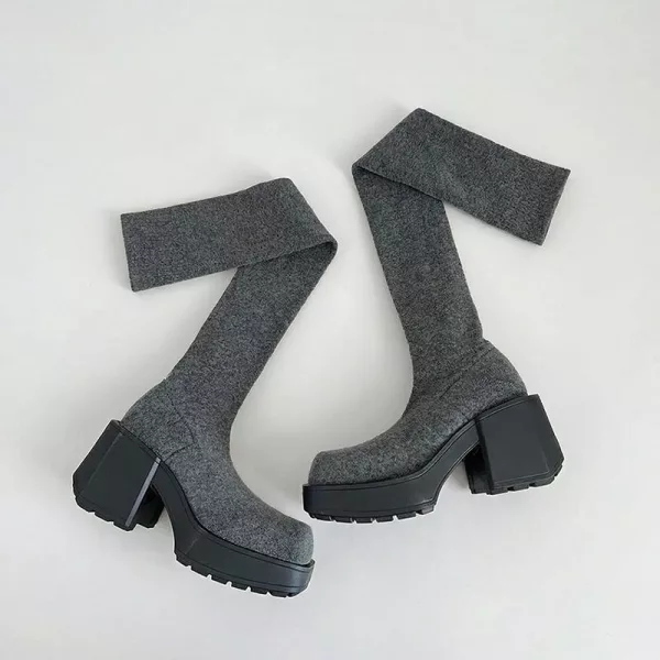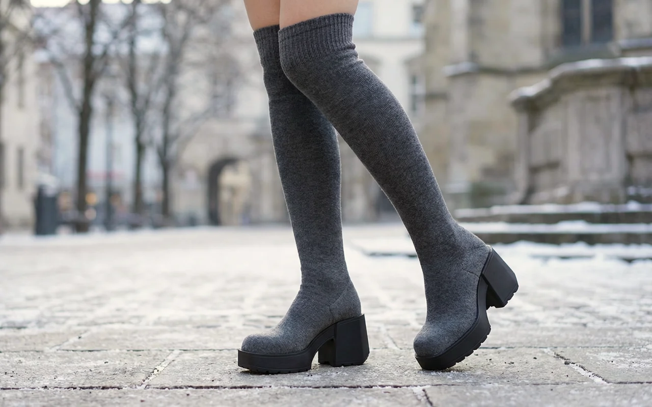 Tjock stickad ovandel håller ben och fötter varma utomhus. Grov plattform skyddar mot blöta trottoarer och kallt väder.