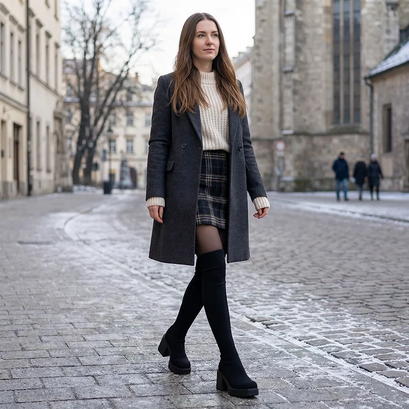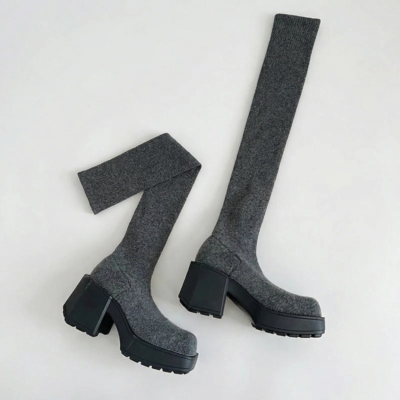Tjock stickad ovandel håller ben och fötter varma utomhus. Grov plattform skyddar mot blöta trottoarer och kallt väder.