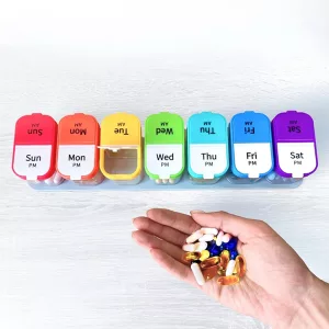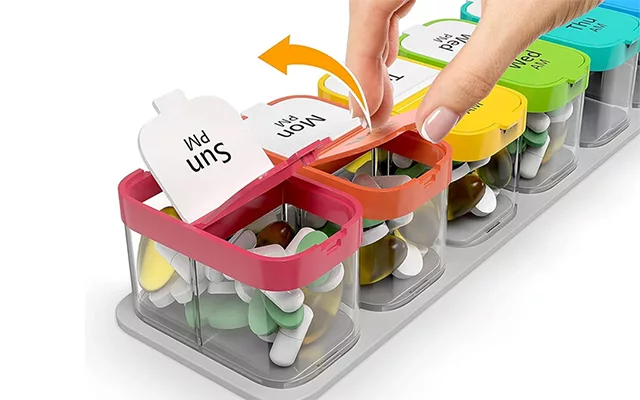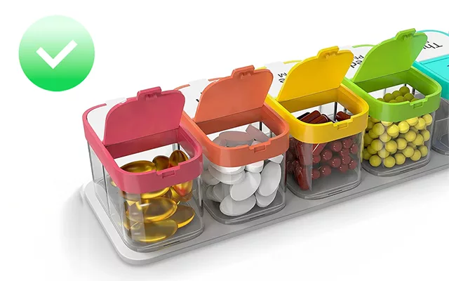 Att sortera tabletter eller vitaminer går snabbt med tydliga fack. Varje fack öppnas smidigt, så alla kan hantera mediciner enkelt.