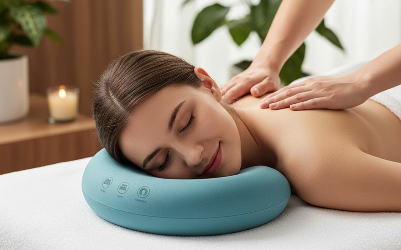 Slappna av samtidigt som du njuter av lugnande avkoppling. Den unika urskärningen ger ett mjukt stöd utan att trycka på kinderna. Varje stund hjälper till att lindra spänningar och lämnar din nacke utvilad. Designad för både hemanvändning och professionellt spa.