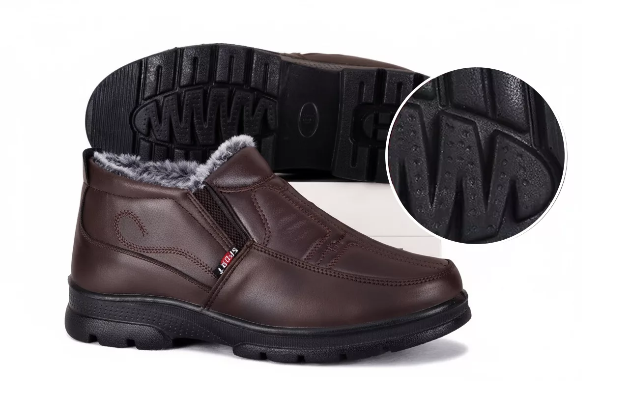 Hala ytor förlorar sin fara i snöiga förhållanden. Sulan greppar stadigt och gör vinterpromenader säkra.