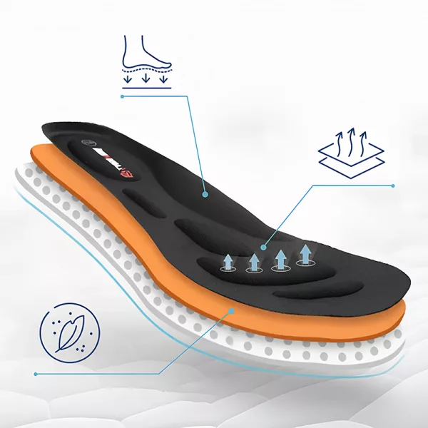 Dämpade sulor minskar trötthet och värk. Den ventilerande designen förhindrar svett från att samlas, vilket håller huden sval och torr.