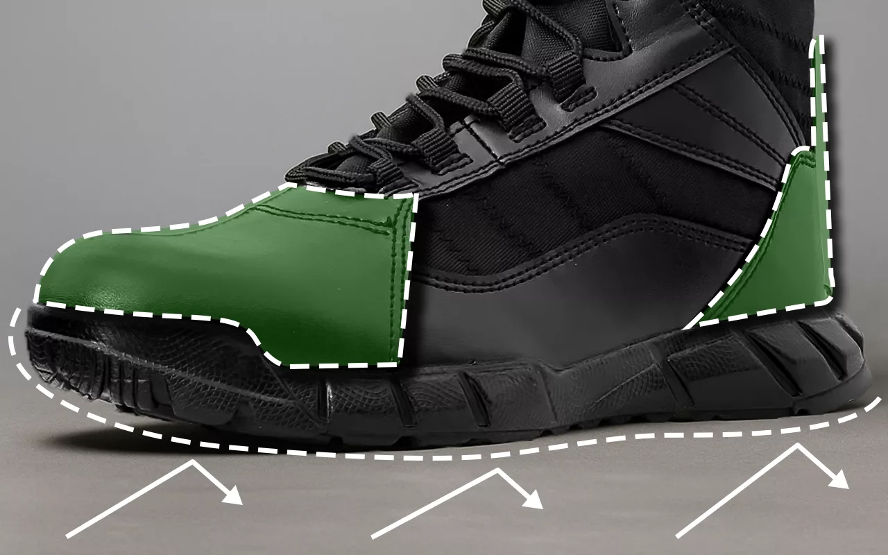 Mockatåhätta och speciell design skyddar tårna. Slitstarkt gummi skyddar fötterna mot stötar och vassa stenar.