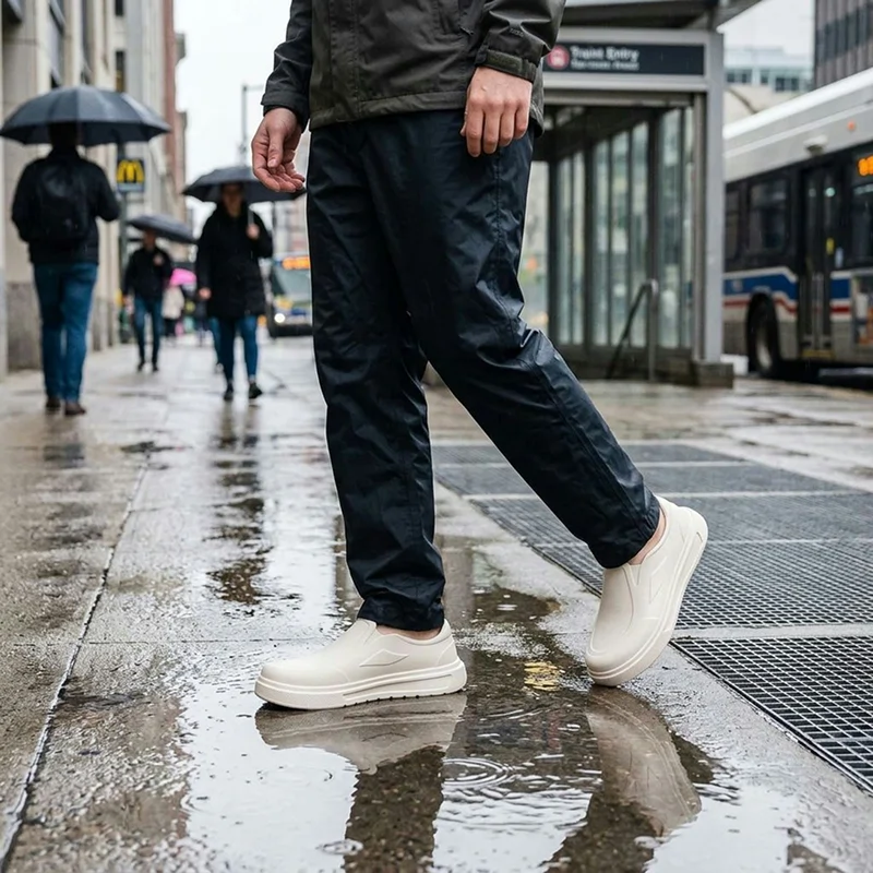 Köpte dessa för pendling och hundpromenader. De går på snabbt, håller mina strumpor torra och greppar våta trottoarer bättre än mina gamla sneakers.