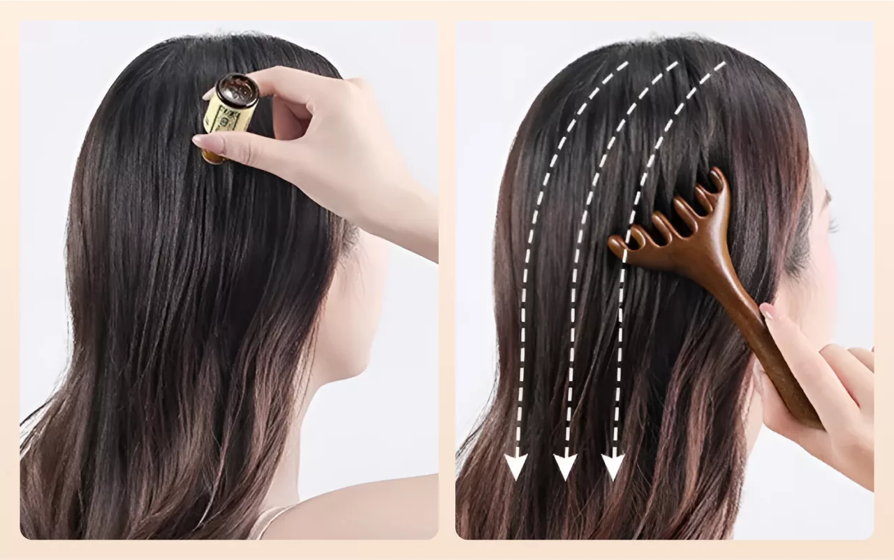 Kombinera med oljor för att öka näringen till hårbotten och glansen. Kammen stimulerar blodflödet för starkare och friskare hårstrån.