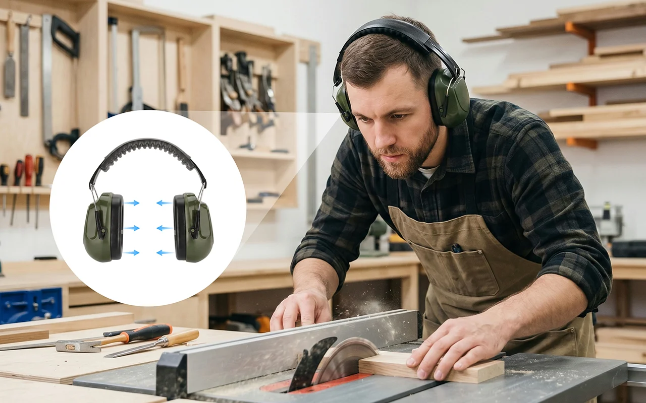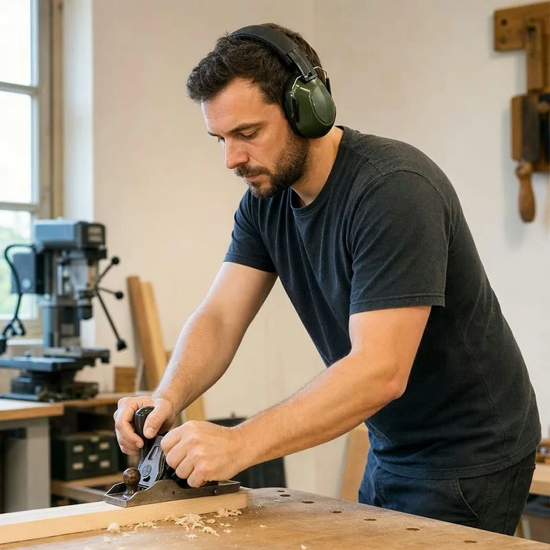 Jag använder dem i min snickeriverkstad med elverktyg igång. Vadderingen sitter mjukt, bygeln trycker inte, och jag kan jobba i timmar utan problem.