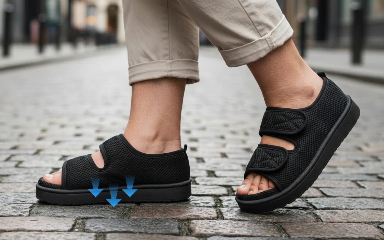 Den vadderade sulan dämpar stötar vid varje steg. Den stadiga basen fördelar vikten jämnt för att minska ledvärk.