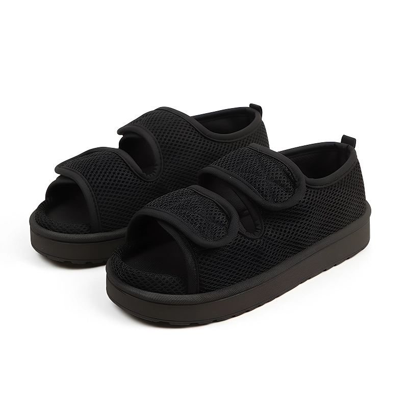 Köpte dessa till min mamma efter operationen. Hon älskar hur den breda öppningen rymmer hennes bandage, och den mjuka, dämpande sulan avlastar hennes knän och höfter.