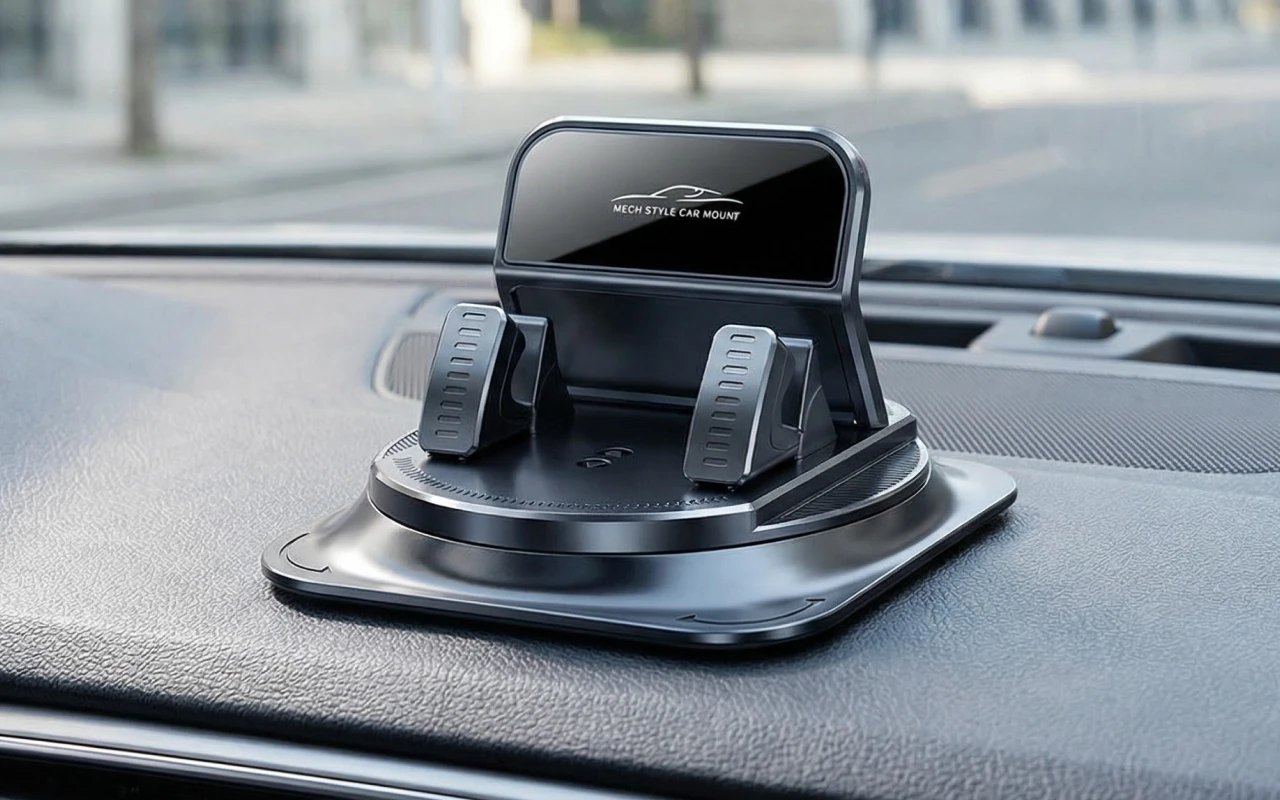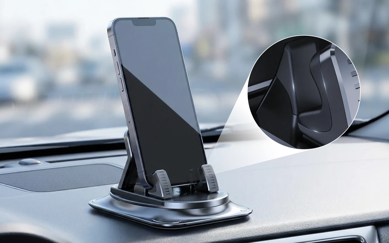 Gummikuddar förhindrar att den glider eller faller vid gupp. Din enhet sitter säkert, även i skarpa svängar.