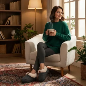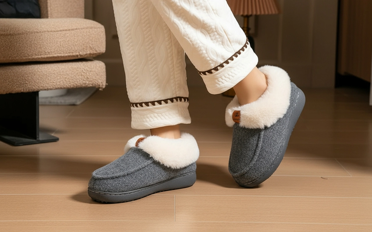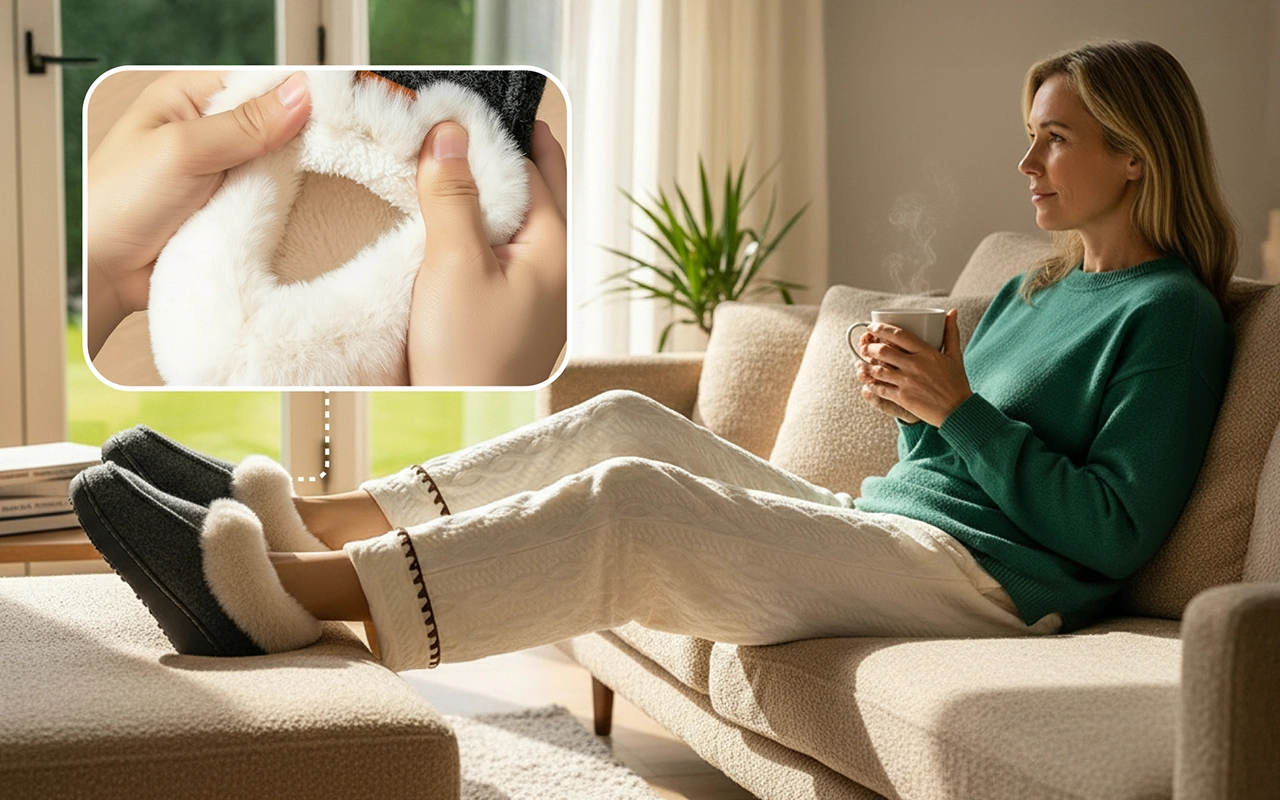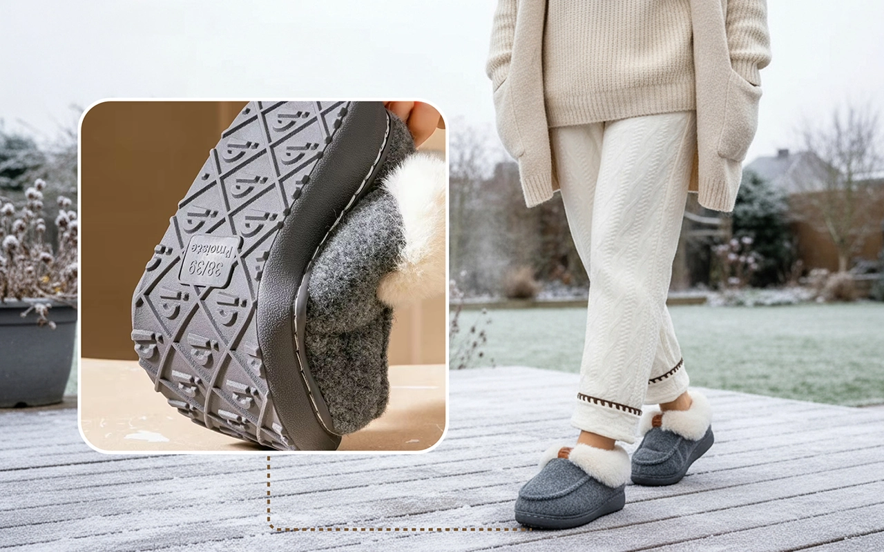 Tjockt plyschfoder omsluter dina fötter i mjuk komfort. Perfekt för kyliga morgnar eller för avkoppling inomhus efter jobbet.