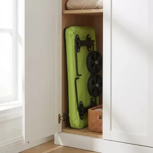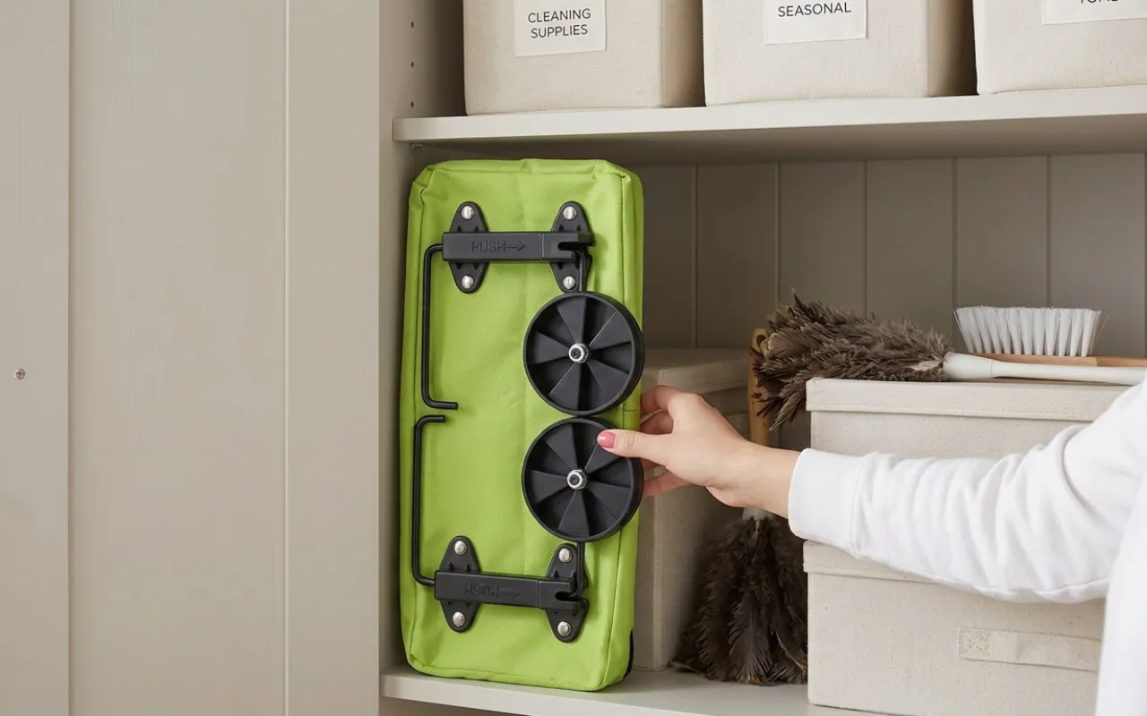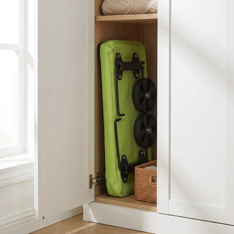 Vagnen fälls ihop till ett smalt paket som får plats i trånga skåp. Den lätta kroppen hängs prydligt bakom dörrar och frigör värdefull hallplats.