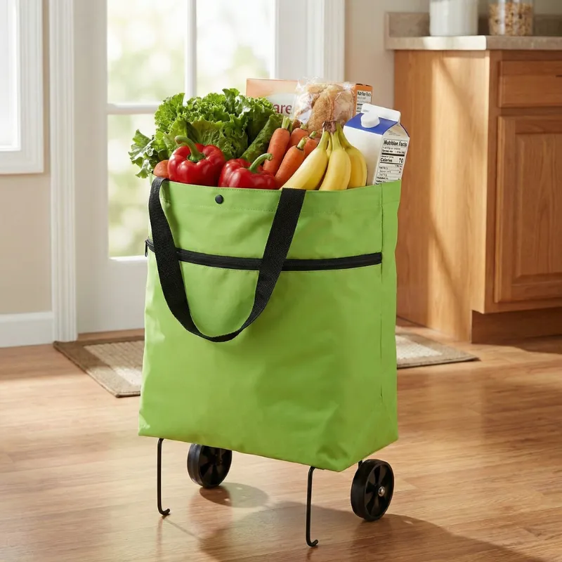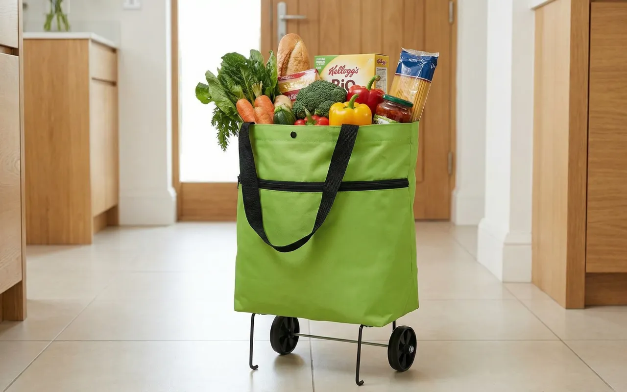 Skaffade den här vagnen efter min axeloperation. Nu lastar jag tunga flaskor och frukt utan att oroa mig. Den fälls ihop på några sekunder och glider lätt in bredvid garderoben.