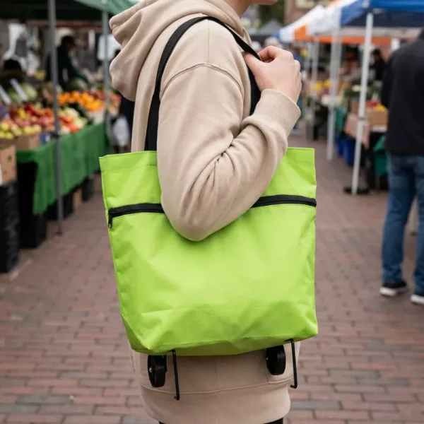 Vår shoppingvagn rymmer flera påsar utan att sjunka farligt. Det slitstarka tyget motstår revor och håller frukt, bröd och flaskor skyddade.