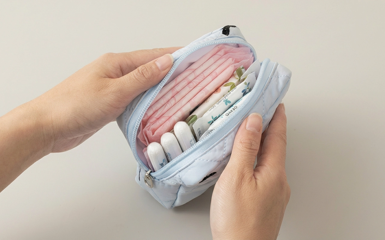 Bär flera saker utan krångel eller oreda. Ortorex-fodralet rymmer bindor, våtservetter och småsaker utan problem.