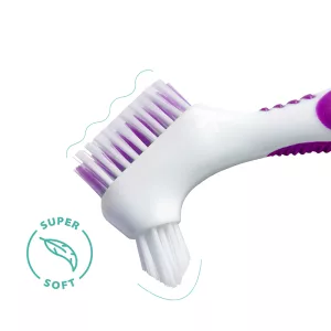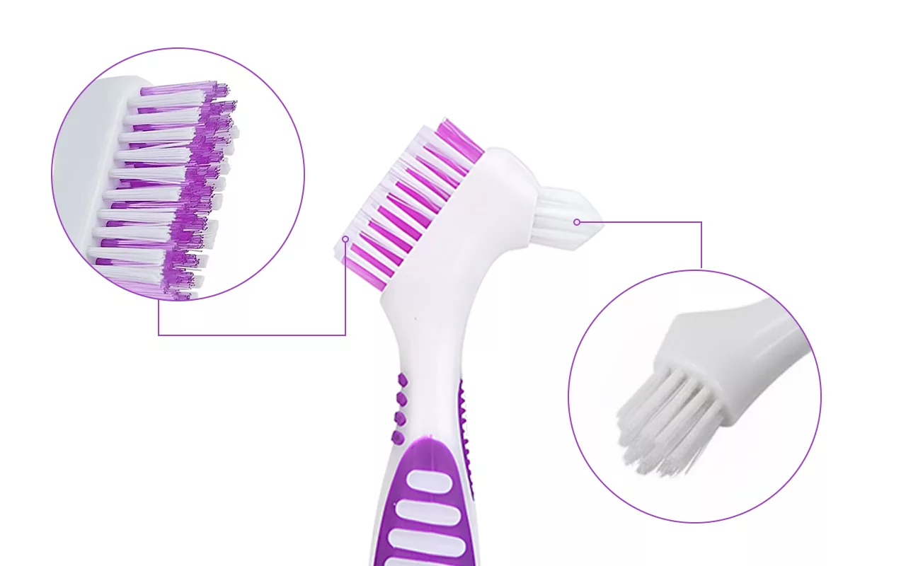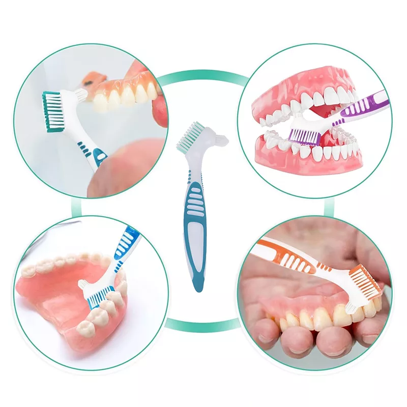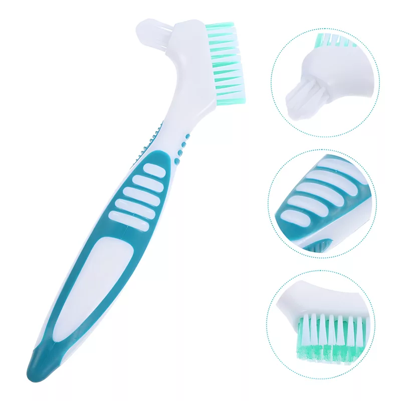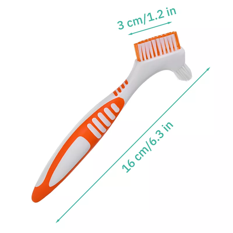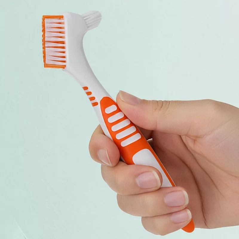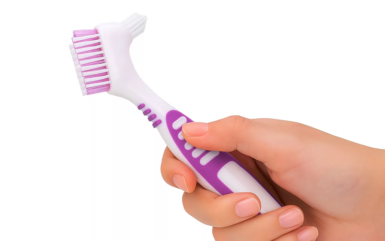 Detta verktyg passar perfekt i handen och gör rengöringen snabb. Jag gillar de dubbla borstsidorna för att nå överallt, och det känns skonsamt mot mina proteser.