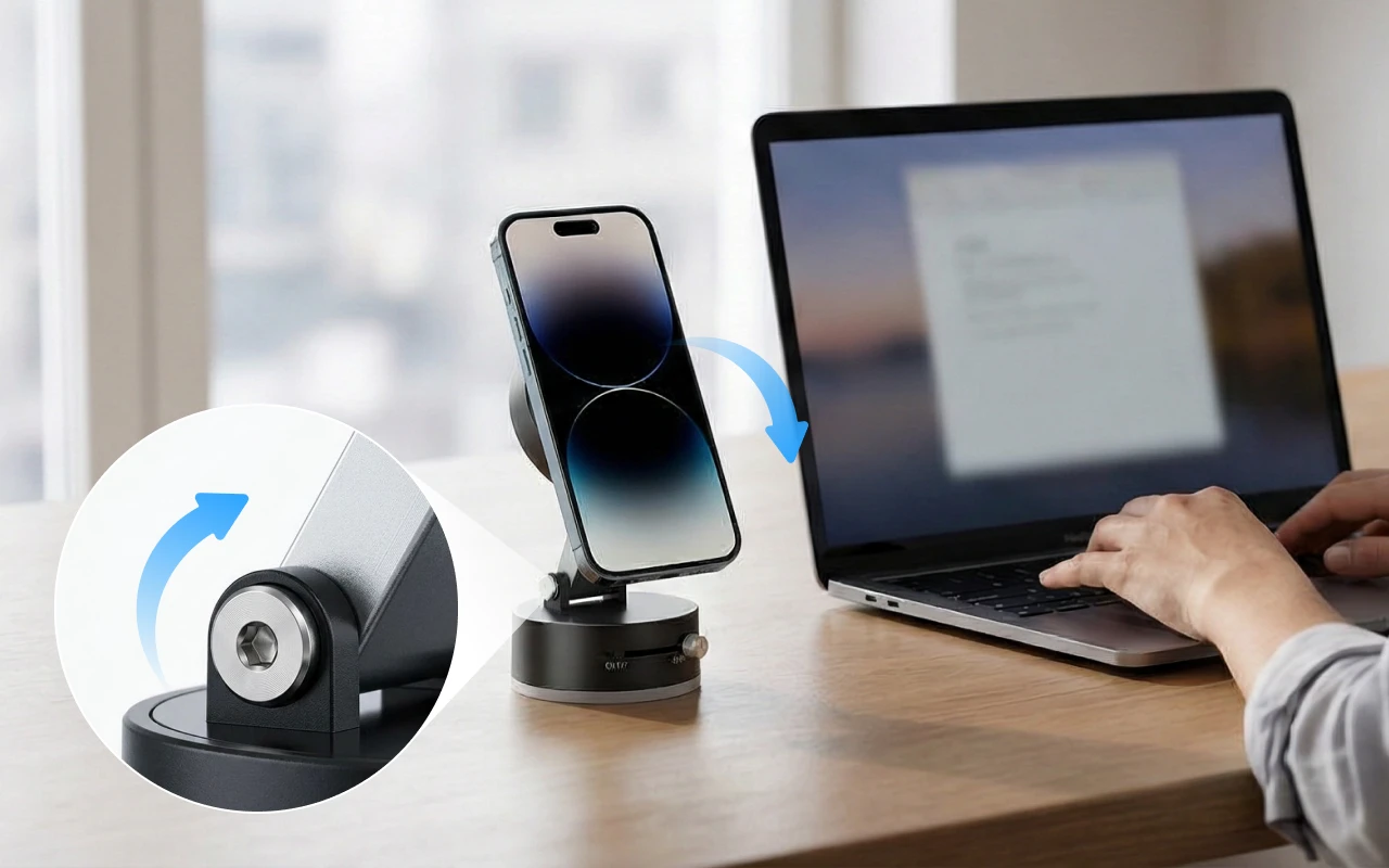 Nöjd med stället till mitt hemmakontor. Magneterna är pålitliga, så min telefon skakar aldrig under möten. Det får plats i ryggsäcken utan problem.