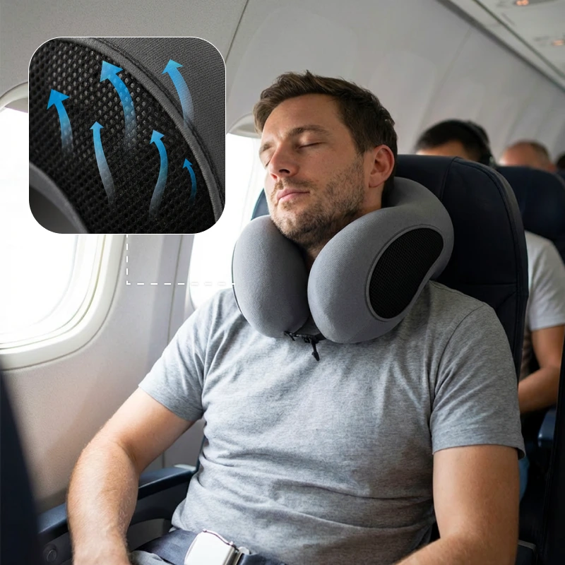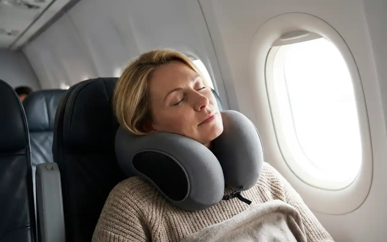 Jag brukar få huvudvärk på flygplan men inte längre! Nackkudden håller mitt huvud stödd så jag vaknar och mår bra varje gång.