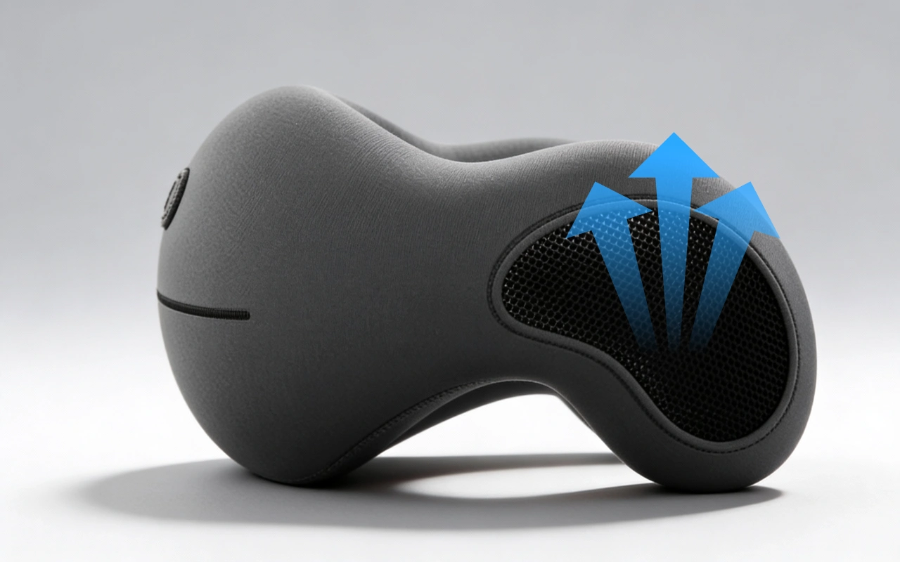 Älskar hur den varsamt sluter sig runt nacken. Inga fler stela muskler efter att ha sovit upprätt. Andningsförmågan håller det dessutom svalt.