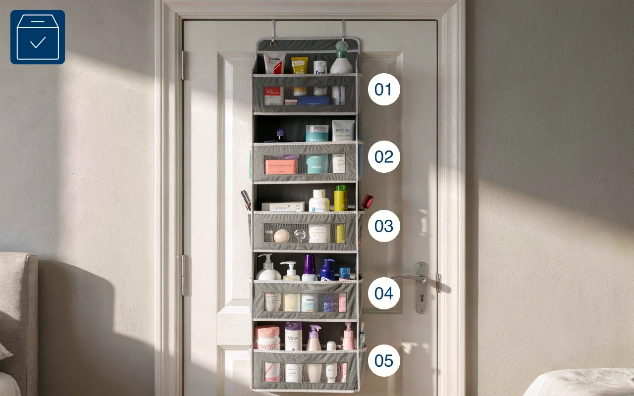 Att använda denna på min sovrumsdörr gav mig extra förvaringsutrymme. Jag har mina laddare, böcker och anteckningsböcker där nu, så mitt skrivbord håller sig rent.