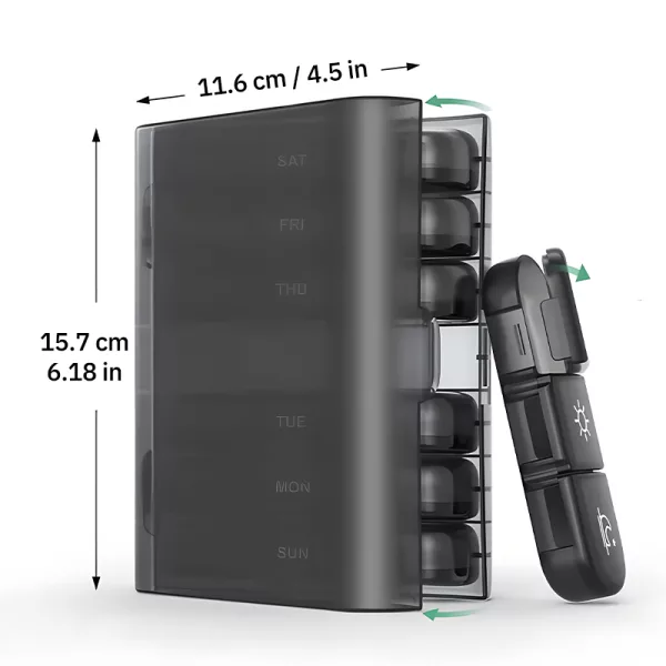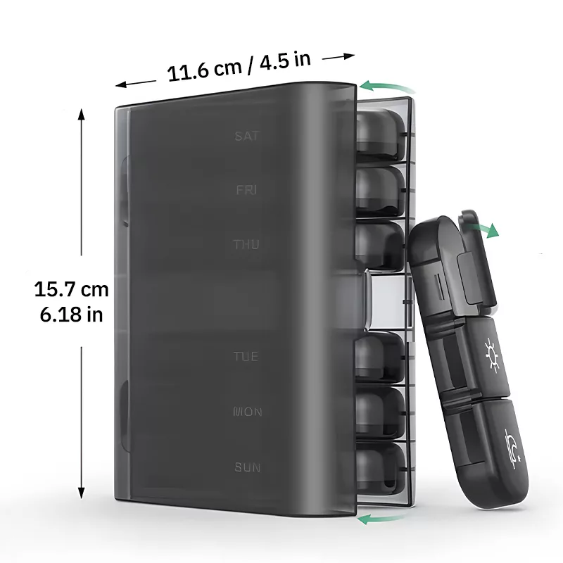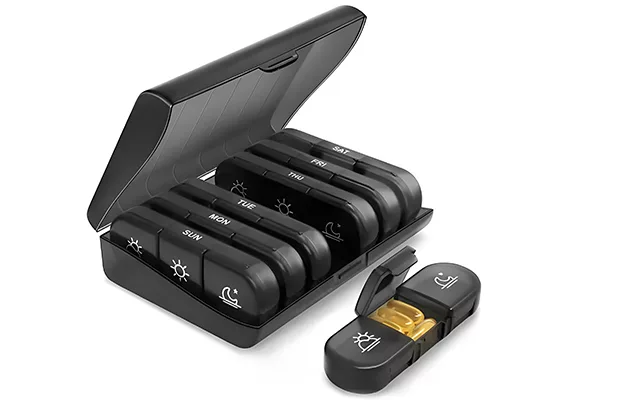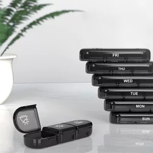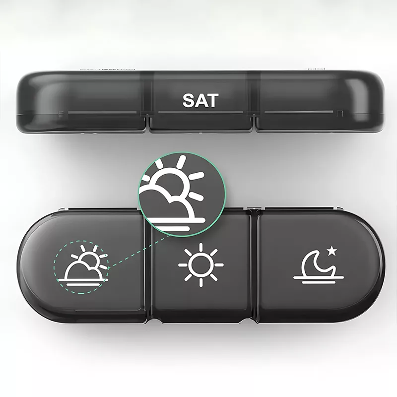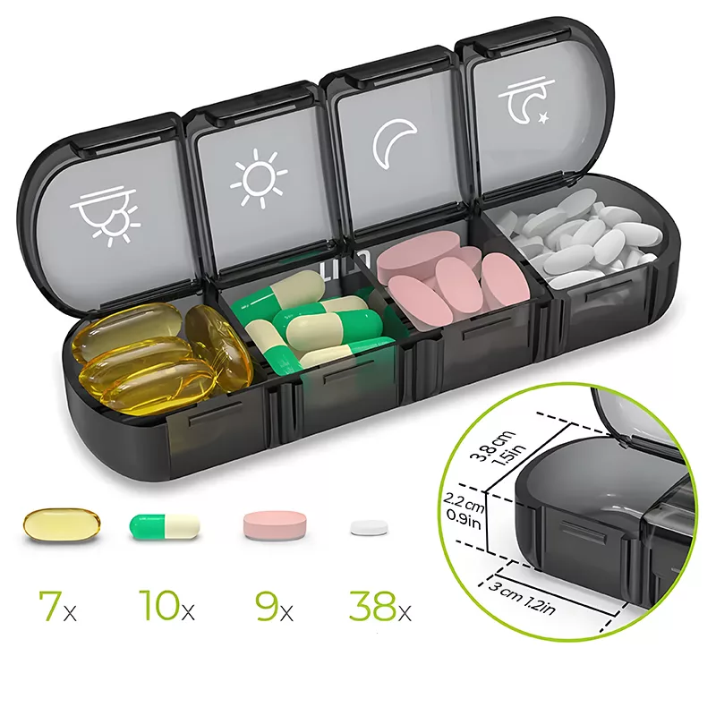 Väldigt hjälpsam för att planera min medicin i förväg. De små facken klickar igen så att inget spills ut när jag slänger den i väskan.