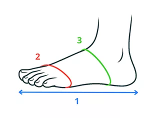 - 3. Vristomkrets. Med samma strumpa på, mät runt vristen – från basen av ankeln, över fotens ovansida och runt hälen.