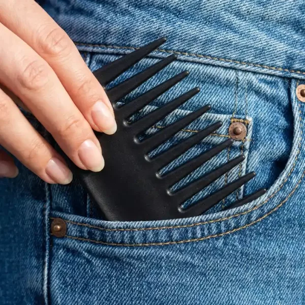 Jag bär nu med mig denna fickkam överallt. Den får plats direkt i mina jeans och reder ut knutar utan att dra. Supermjuk och fastnar aldrig i mina lockar!