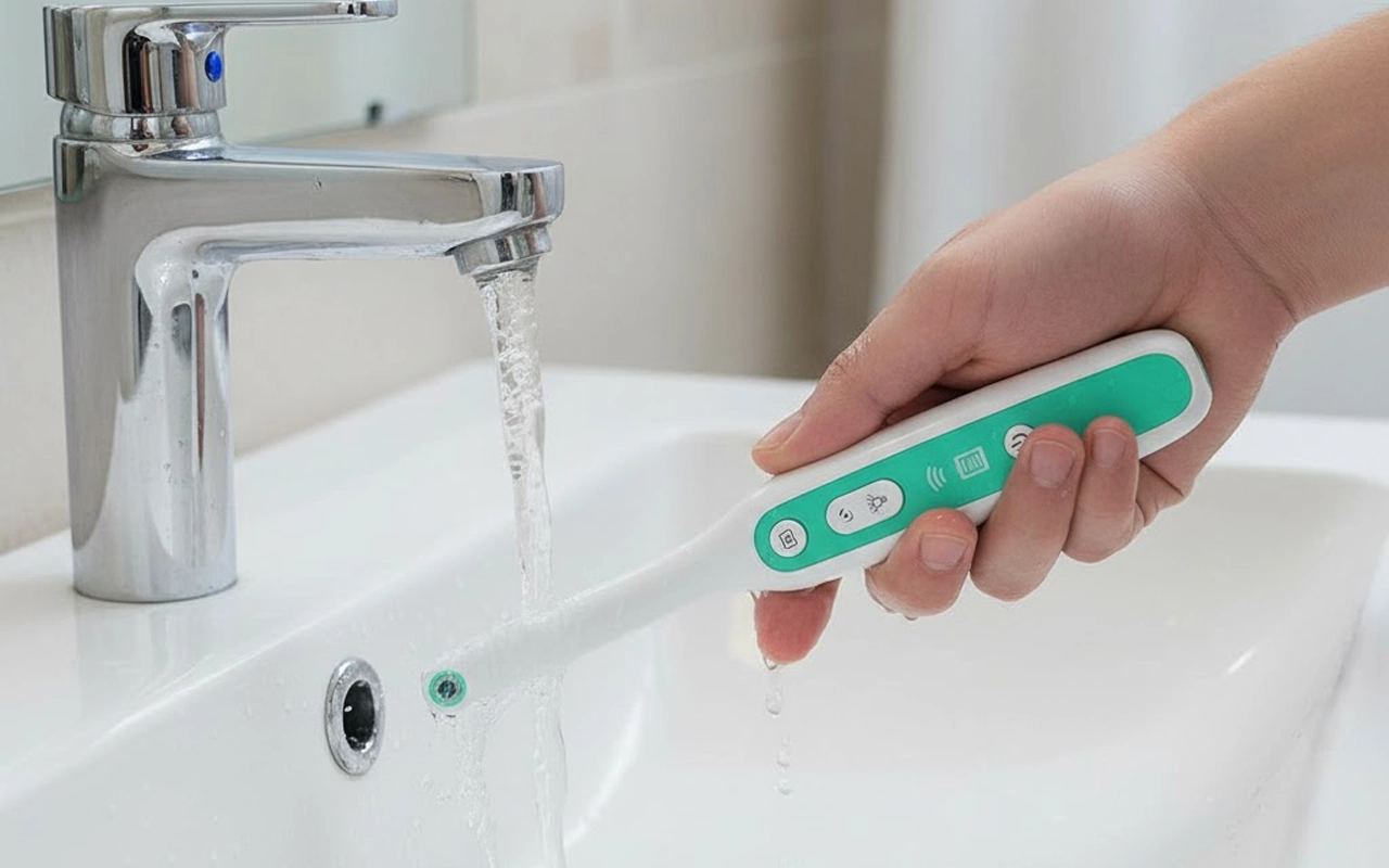 Vattentät så jag kan bara skölja den under kranen efter användning. Mina barn tycker det är kul att kolla sina tänder innan tandborstning på kvällen.