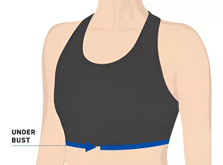 - 2. För att hitta omkretsen under bysten, linda måttbandet runt din bröstkorg, direkt och jämnt under bysten.