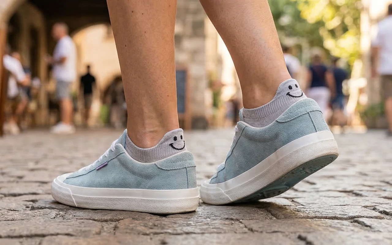 Jag står på fötterna i en butik i timmar. Dessa ankelsockor håller fötterna luftiga och mjuka, och det glada lilla ansiktet känns som ett litet hemligt skämt.
