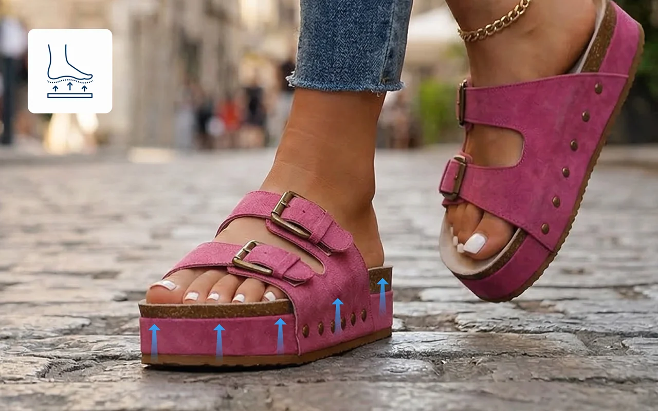 Den tjocka plattformen absorberar belastning och minskar trötthet snabbt. Håll dig aktiv längre utan värkande fotvalv eller ömma hälar.