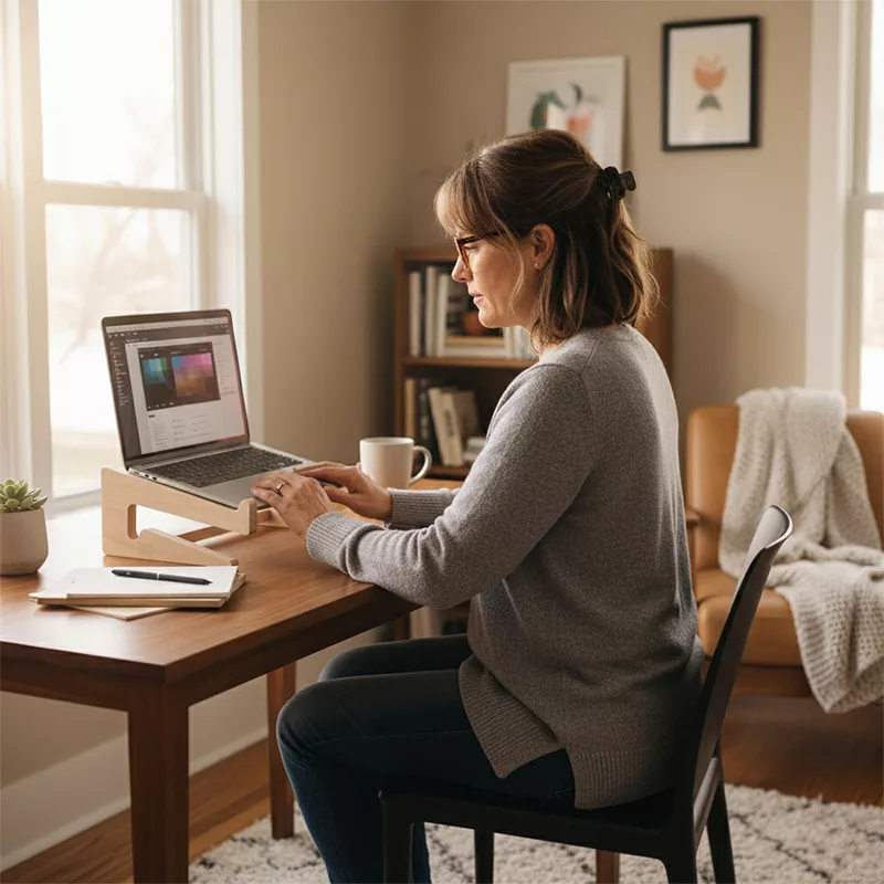 Varje morgon sitter jag vid fönstret med mitt kaffe och laptopen på detta ställ. Träet känns varmt och den glider aldrig medan jag skriver.