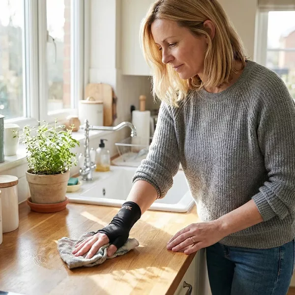 Andningsaktivt stretchtyg omsluter din hand varsamt för komfort hela dagen. Inget nyp eller glid, vilket ger stabilt stöd under hela användningen.