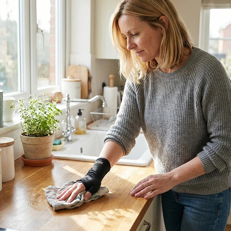 Andningsaktivt stretchtyg omsluter din hand varsamt för komfort hela dagen. Inget nyp eller glid, vilket ger stabilt stöd under hela användningen.